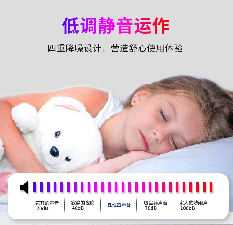 低噪电机:消音棉层、缓冲垫、减震软胶;